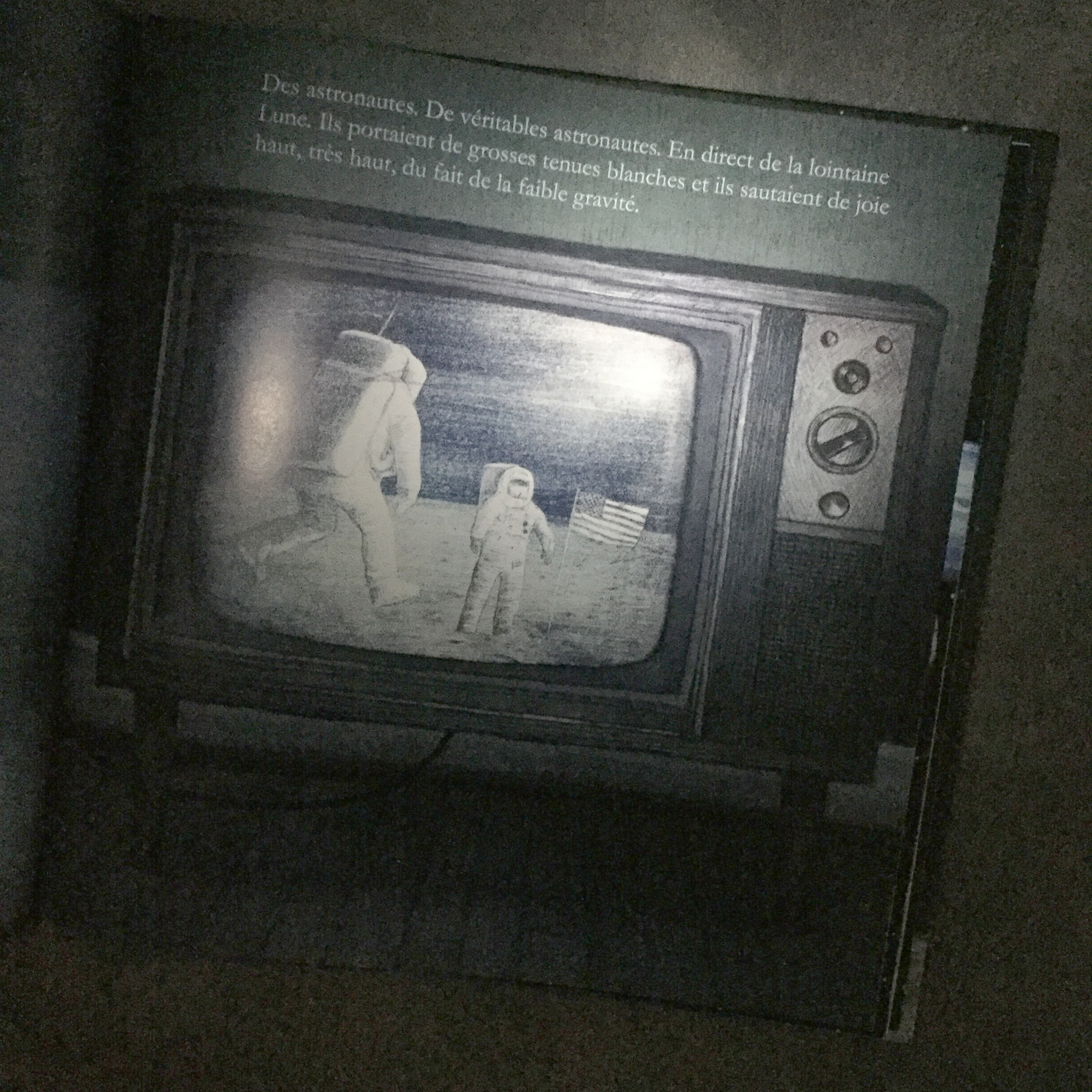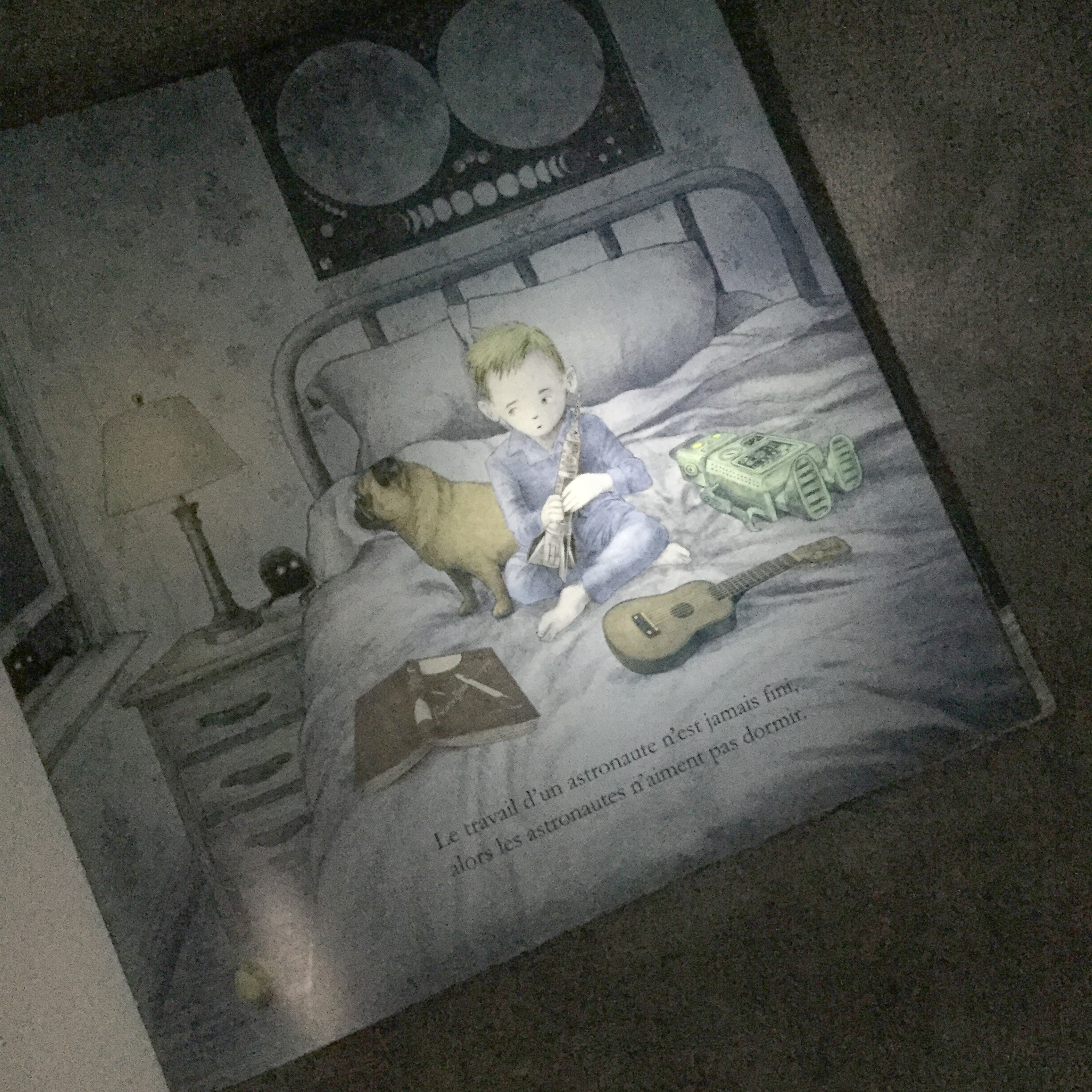En effet, LE NOIR DE LA NUIT est un superbe album qui raconte l’enfance de Chris et de sa grande peur du noir… peur de tous les enfants un jour… sauf qu’ici nous découvrons l’histoire de ce petit garçon qui est réellement devenu astronaute en grandissant !