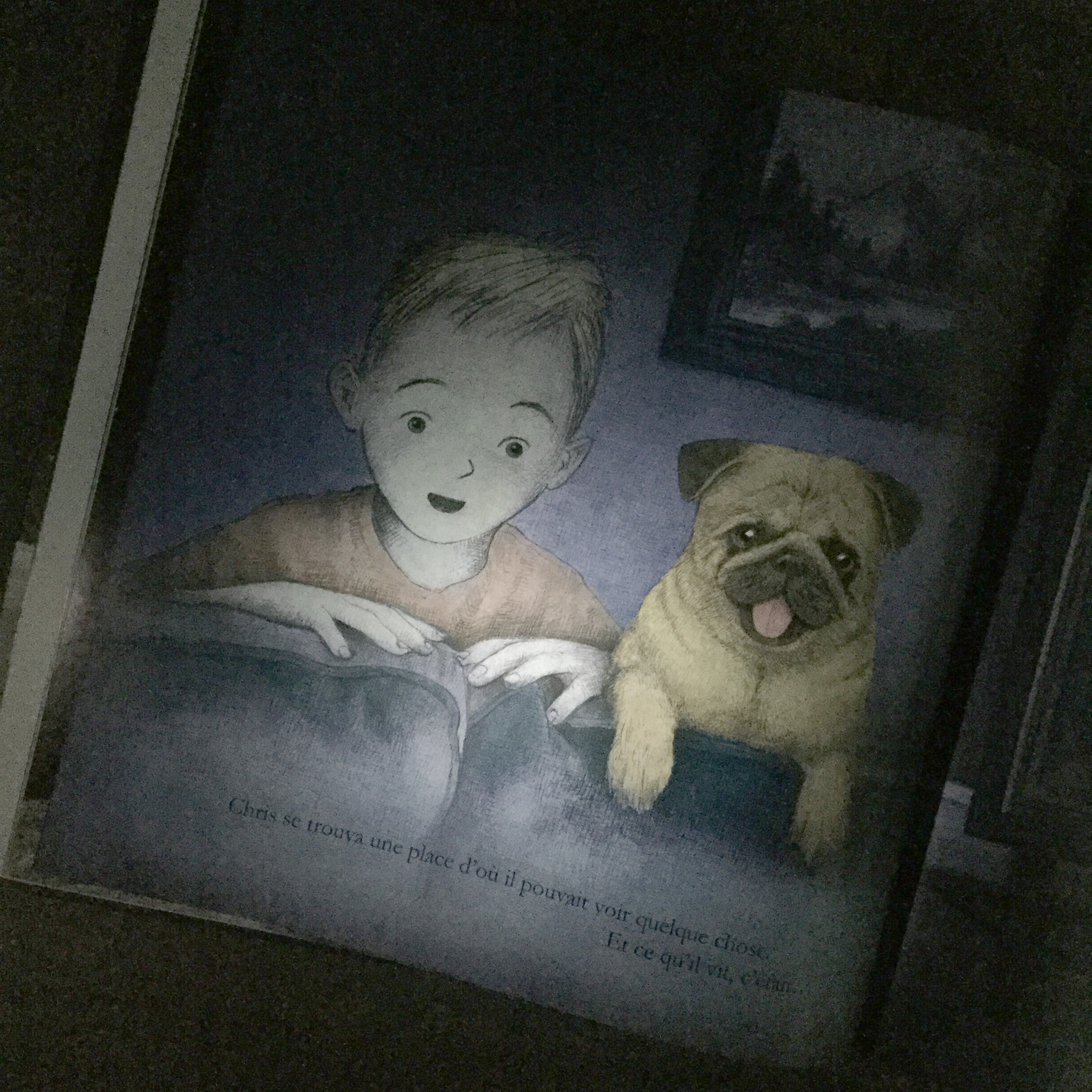 L’histoire du petit Chris est donc inspirée de la sienne. Le jeune garçon s’imagine astronaute et pilote sa fusée imaginaire avec pour équipage son chien. Quand vient l’heure d’aller se coucher le noir attire toutes sortes d’extraterrestres, chaque ombre est un monstre qui se glisse dans sa chambre. Ses parents ont tout essayé pour le rassurer.