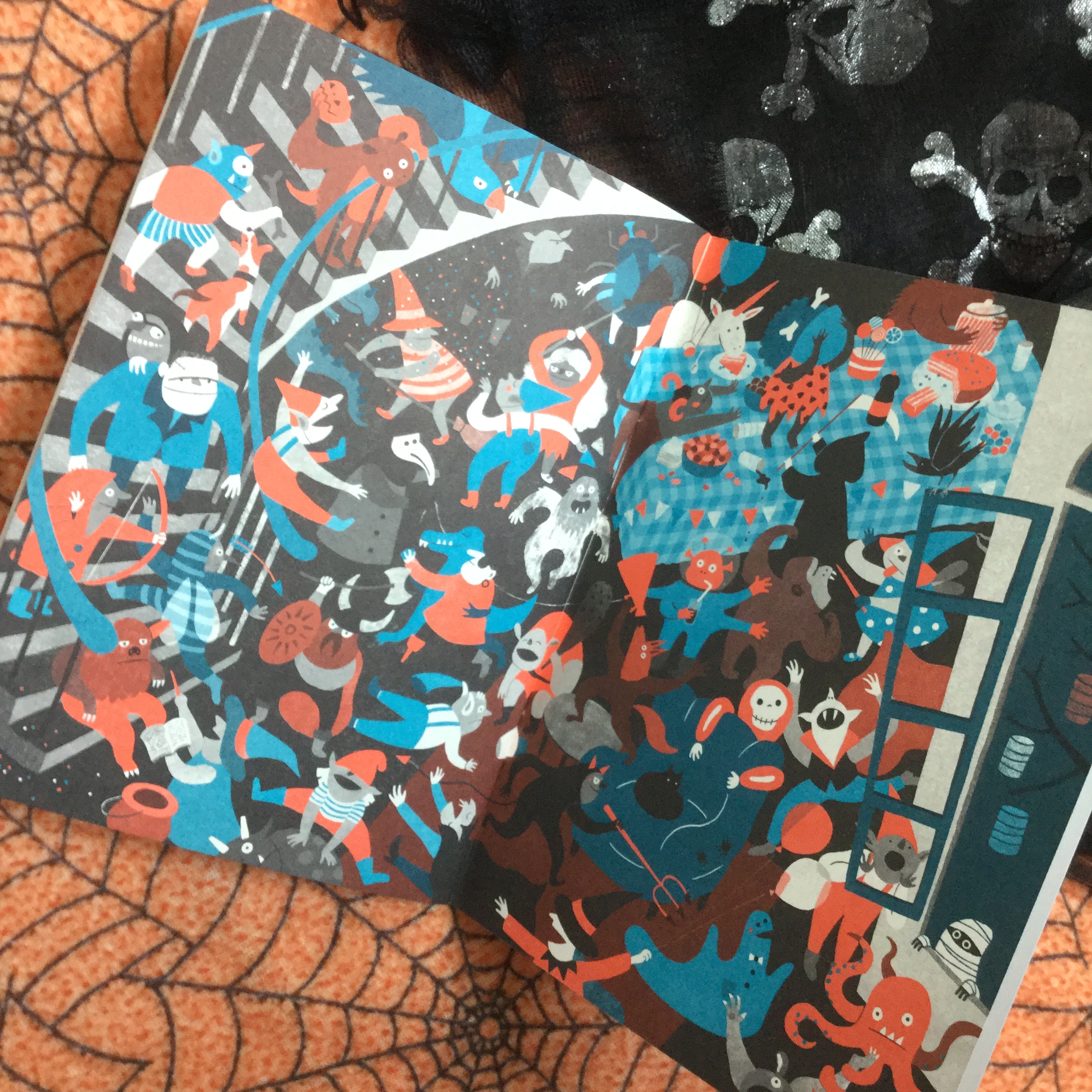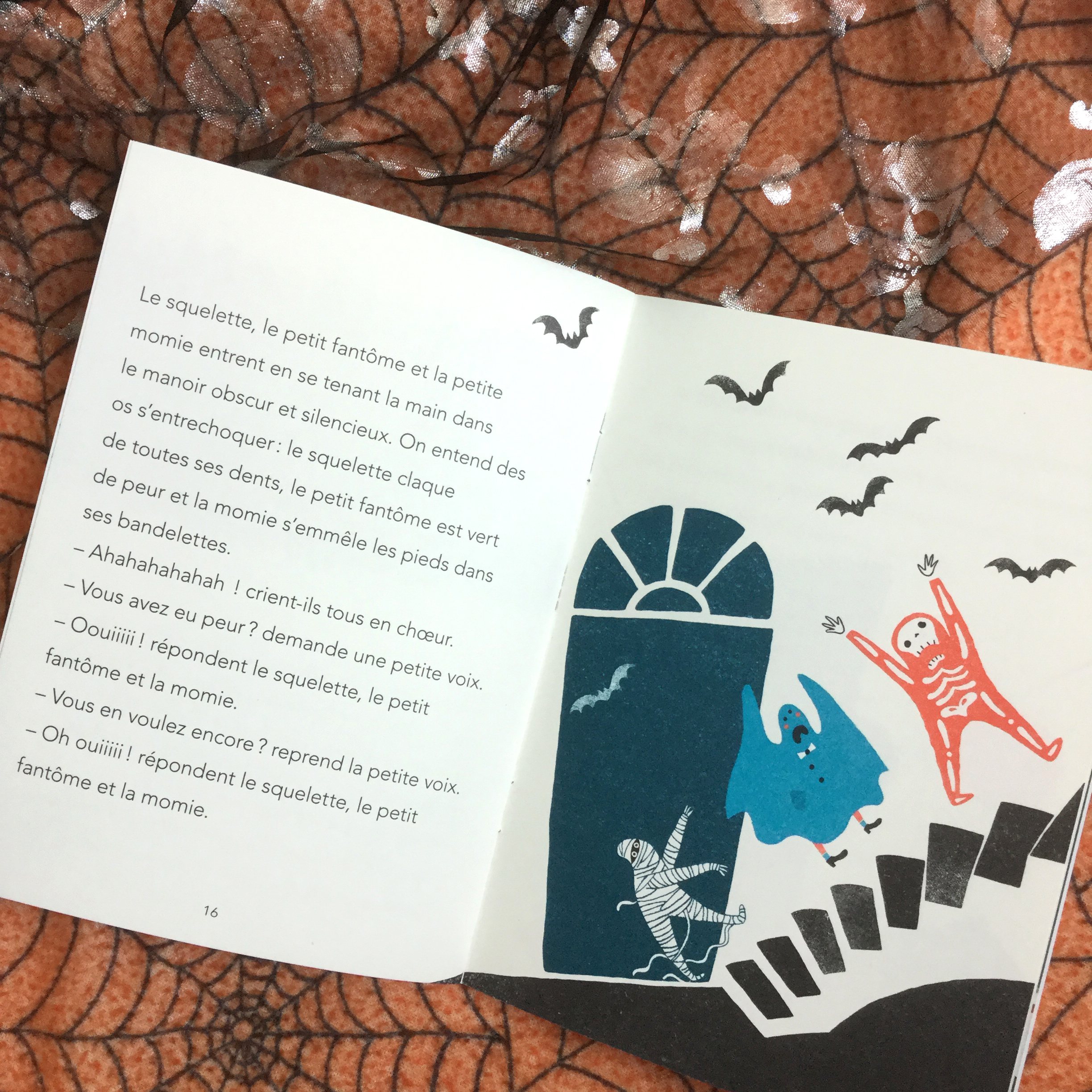 Nous avons adoré partager cette rencontre et faire un bout de chemin avec les trois petits personnages si bien illustrés en orange et bleu par Andrea Espier. Ce petit roman est certainement le plus mignon de tous les romans qui font peur pour enfant. Le texte de Cécile Emeraud est absolument parfait. On y retrouve tous les ingrédients de l’épouvante et de l’horreur : un brouillard épais avec la lueur d’un réverbère, des citrouilles éclairées, des corbeaux, des araignées et des chauves-souris, du plancher qui craque, des fenêtres qui claquent et des cris effrayant… Les petits personnages se plaisent eux-mêmes à se faire peur gentiment.