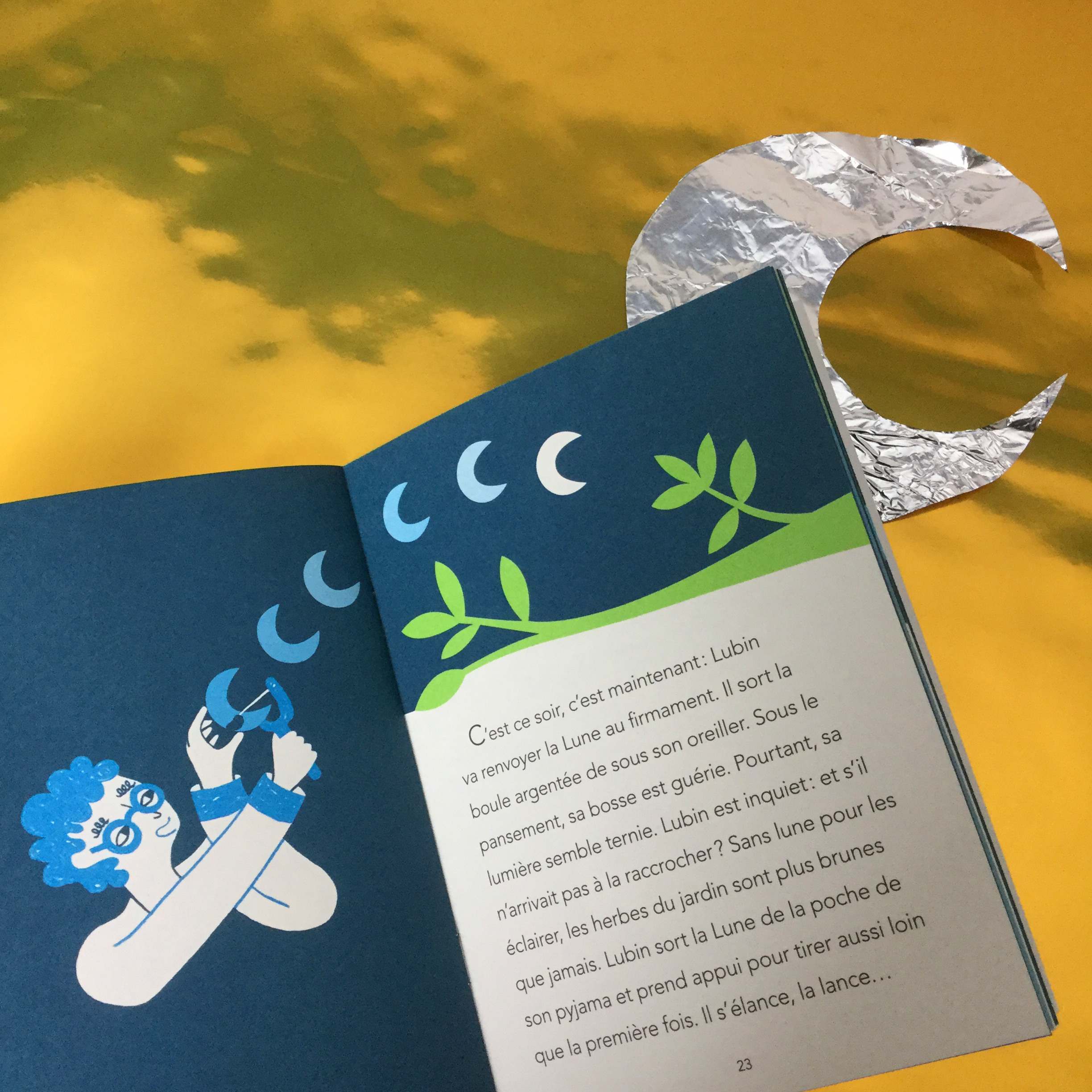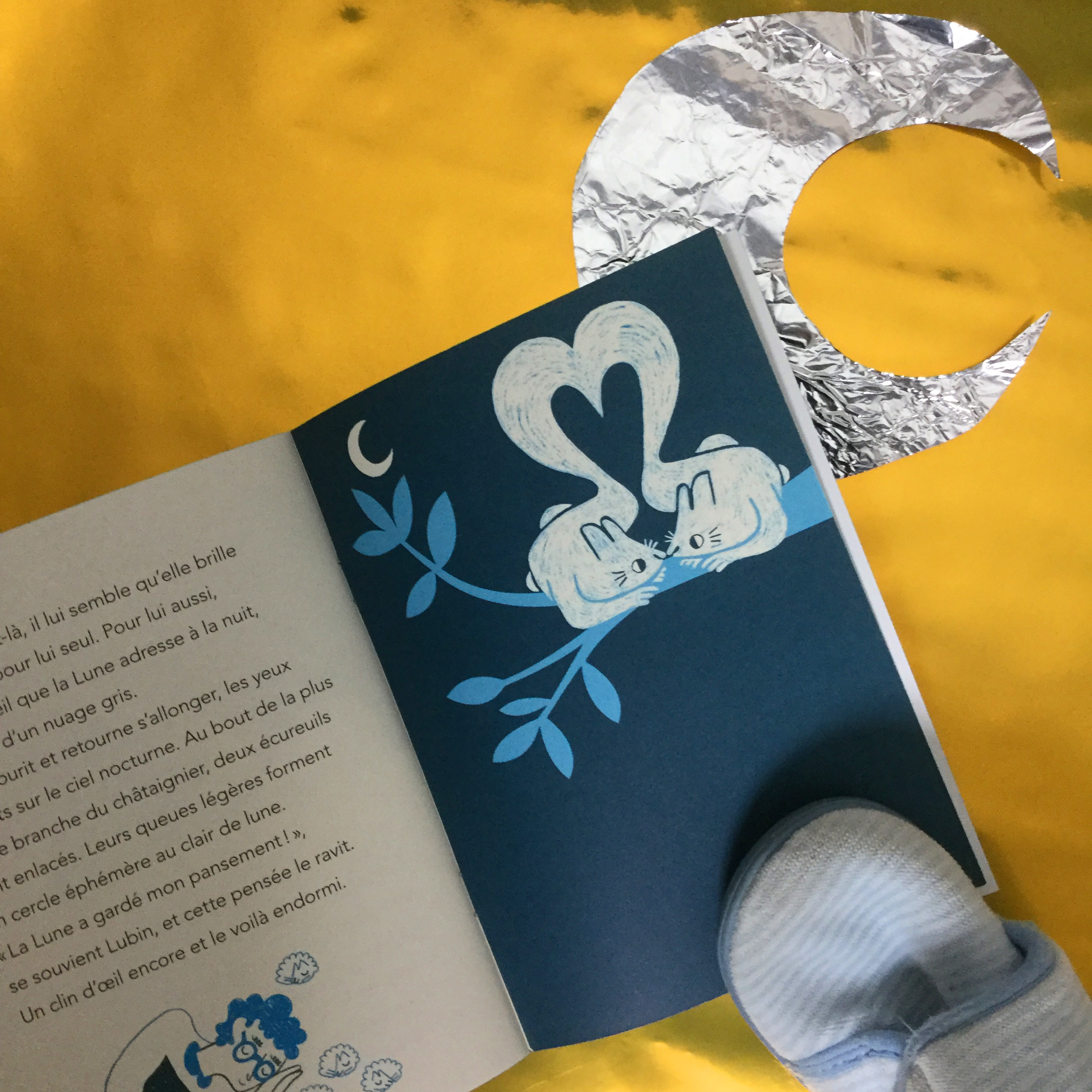 Lubin, le jeune petit héros de cette histoire CHAUSSON DE LUNE est certainement un descendant de Jean de la lune. Lubin a beau compter les moutons, ce soir là il ne s’endort pas. La lune toute ronde l’éclaire et le nargue. Ni une ni deux, Lubin attrape son chausson et le lance par la fenêtre en direction de la lune. Contre toute attente voilà la lune qui dégringole dans leur jardin et c’est le chausson qui la remplace dans le ciel.