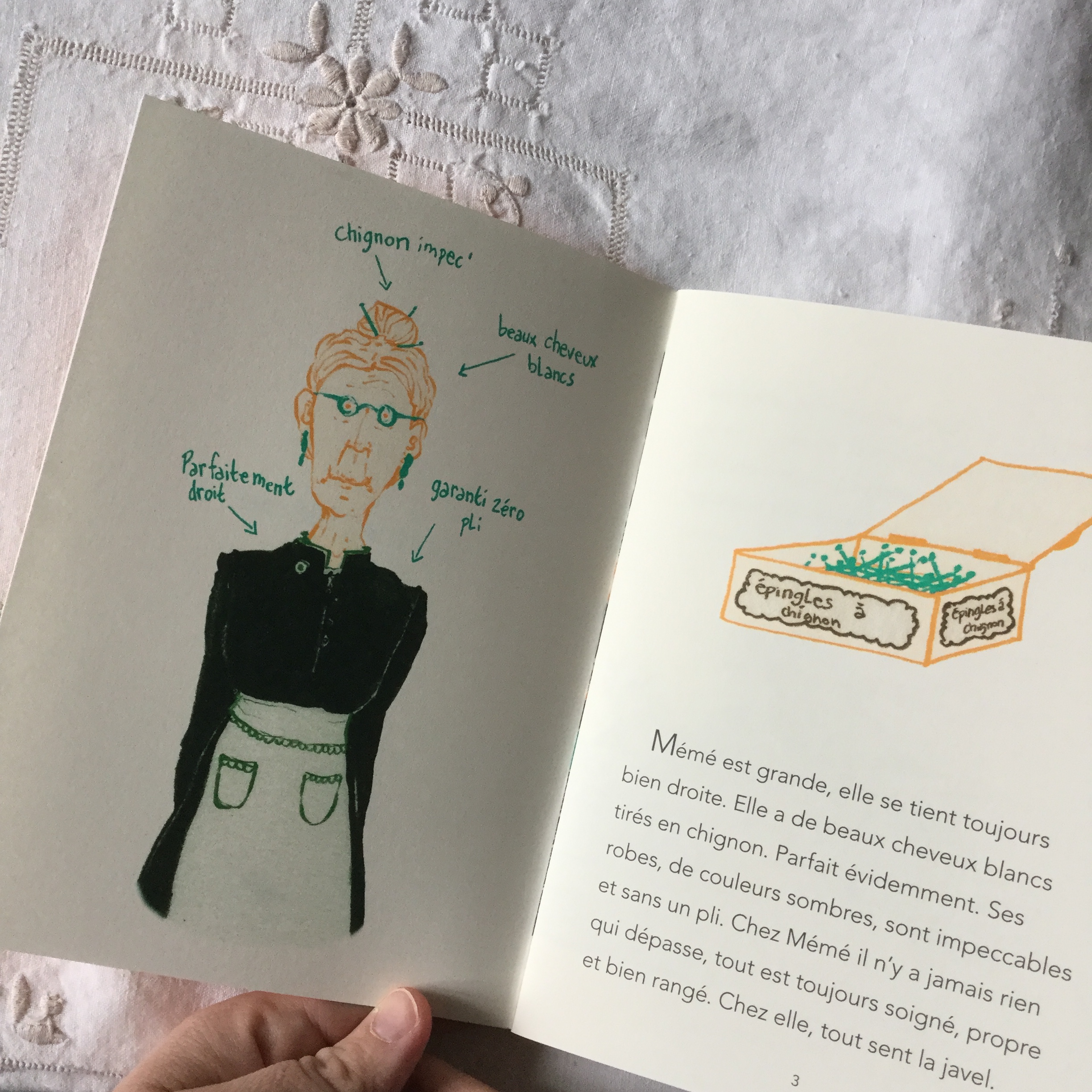 Sa grand-mère est la mémé parfaite, chignon impeccable sur la tête, robe bien repassée et tablier nickel chrome. Bien sûr cette mémé qui se tient toujours bien droite habite dans un intérieur parfait ou tout est impeccable, où rien ne dépasse. Cela sent la javel, chaque objet a sa place et a une histoire ; chaque objet est relié à un souvenir que Mémé transmet à la petite fille heureuse de partager des moments de complicité avec sa grand-mère. Voyez-vous cette mémé fait partie des anciens auprès desquels on se sent bien.