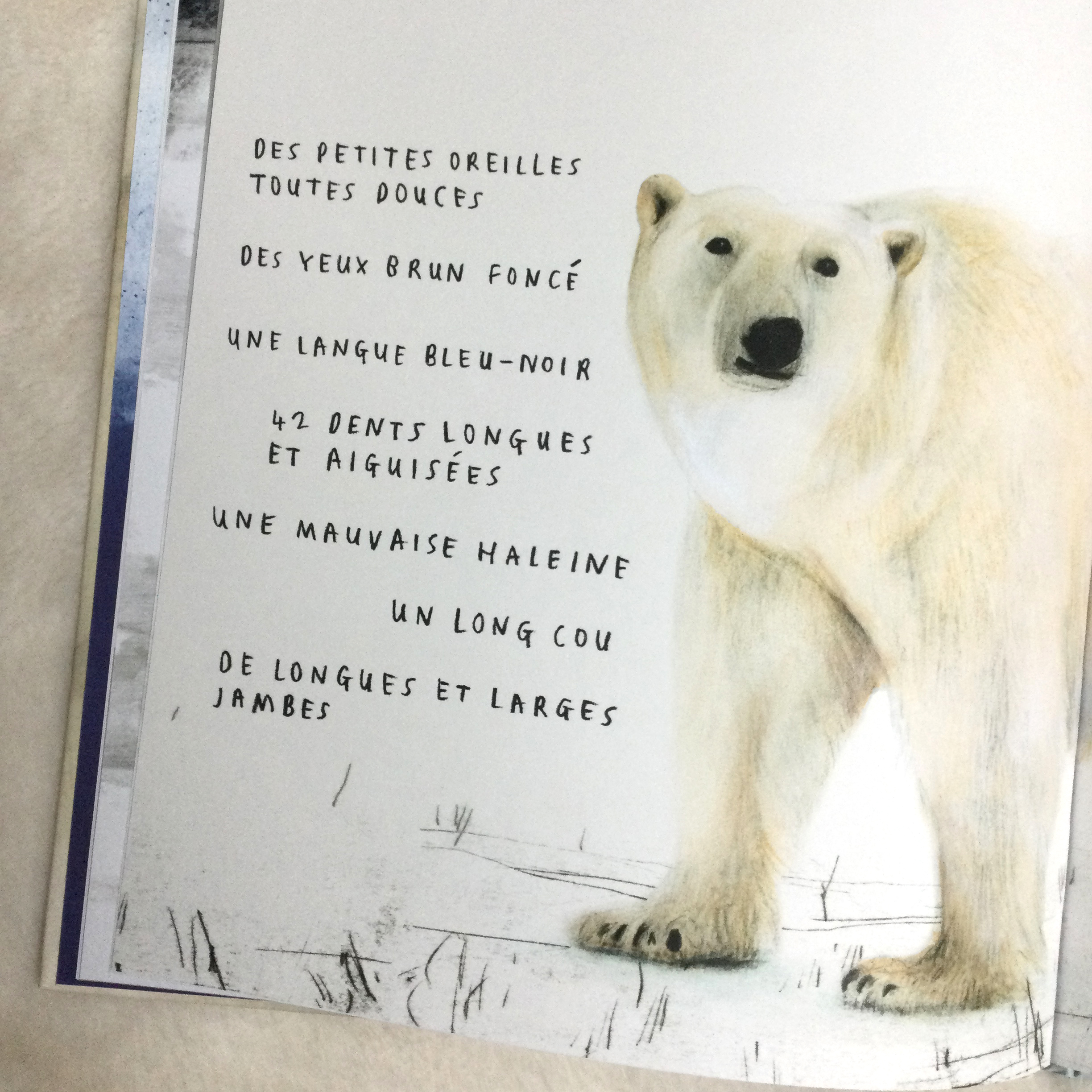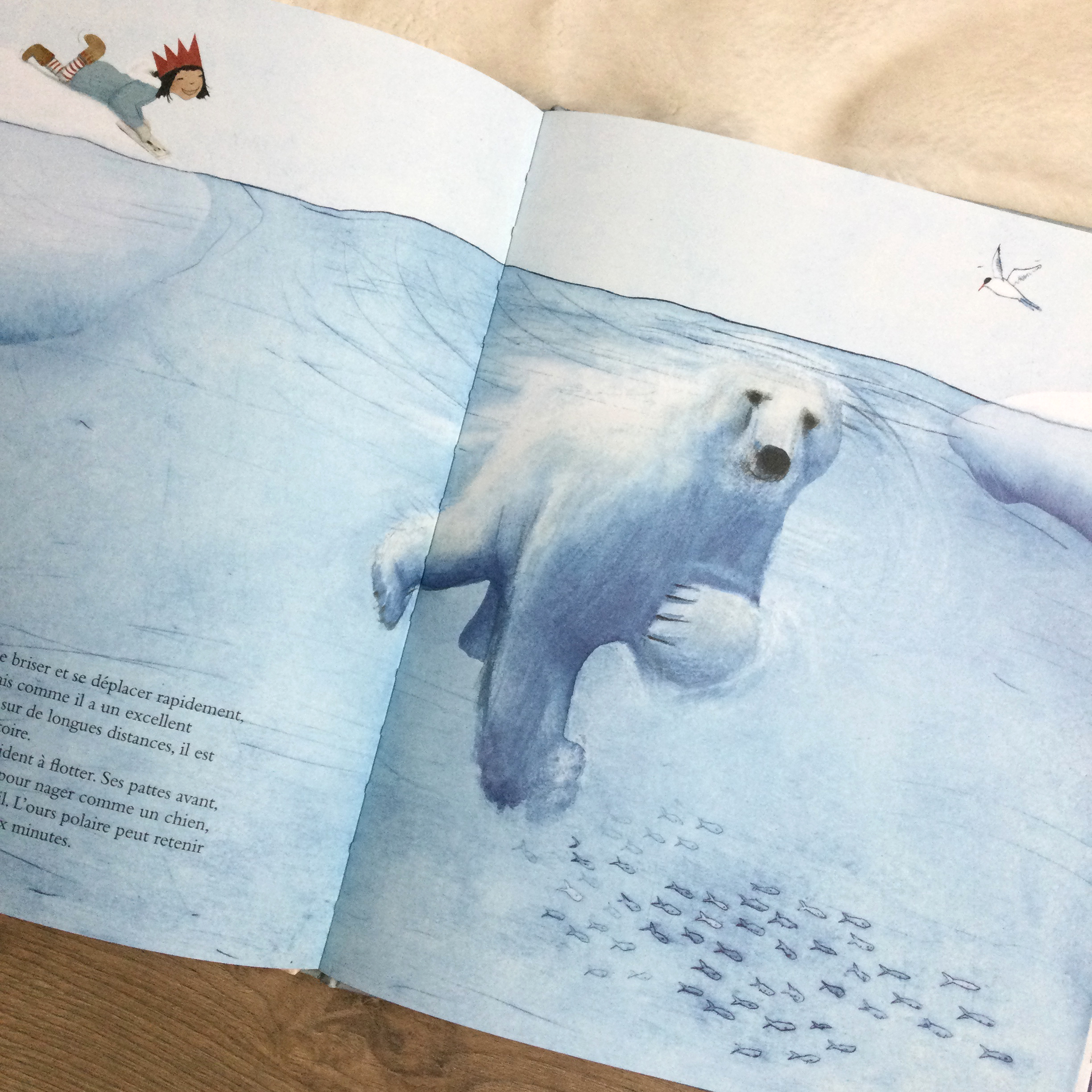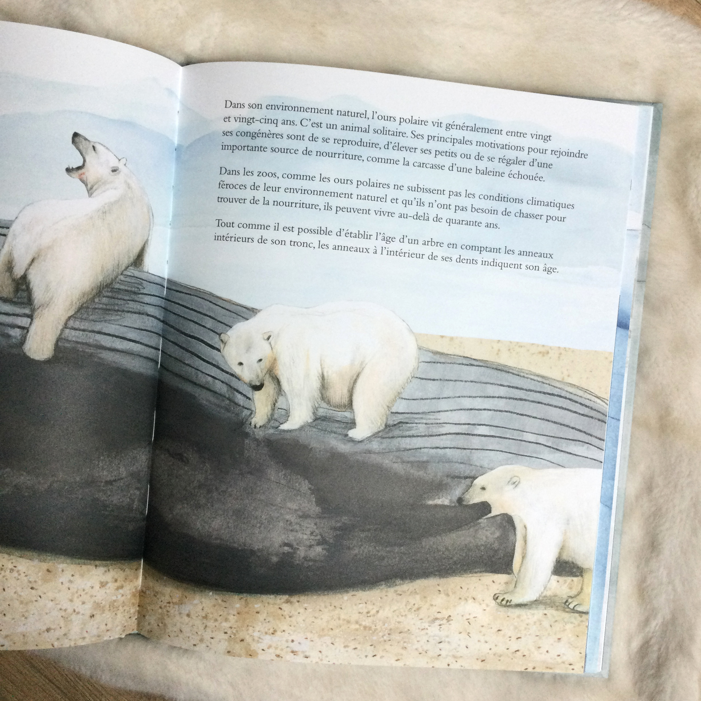 On apprend plein de choses curieuses sur l’ours polaire : qu’il a la peau noire sous son épaisse fourrure, qu’il pèse le poids d’une vingtaine d’enfants de 7 ans, qu’il peut sentir un phoque à des kilomètres à la ronde, autant d’informations que les enfants retiendront certainement. Espérons qu’ils seront ainsi sensibles à la cause de l’animal qu’il faut protéger.