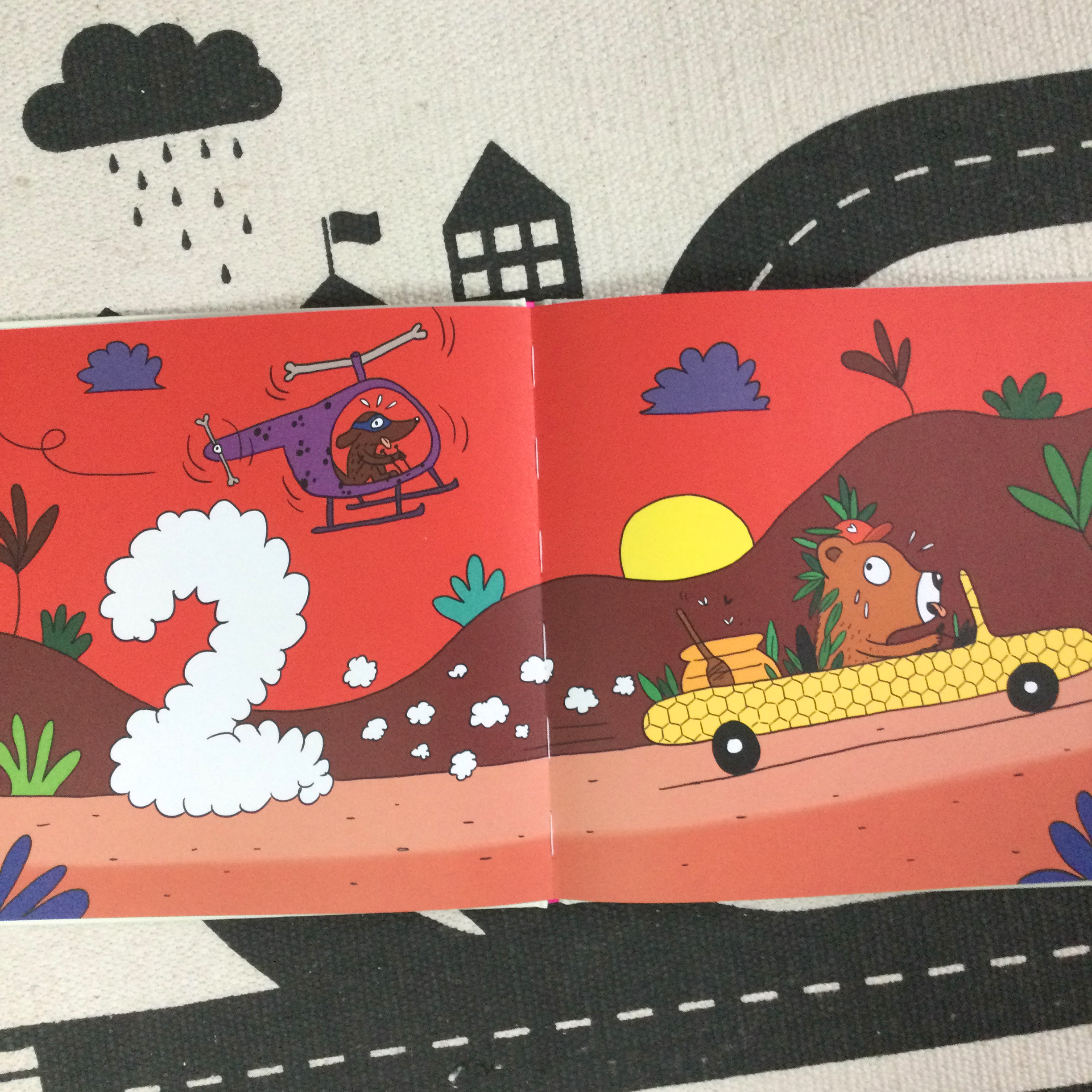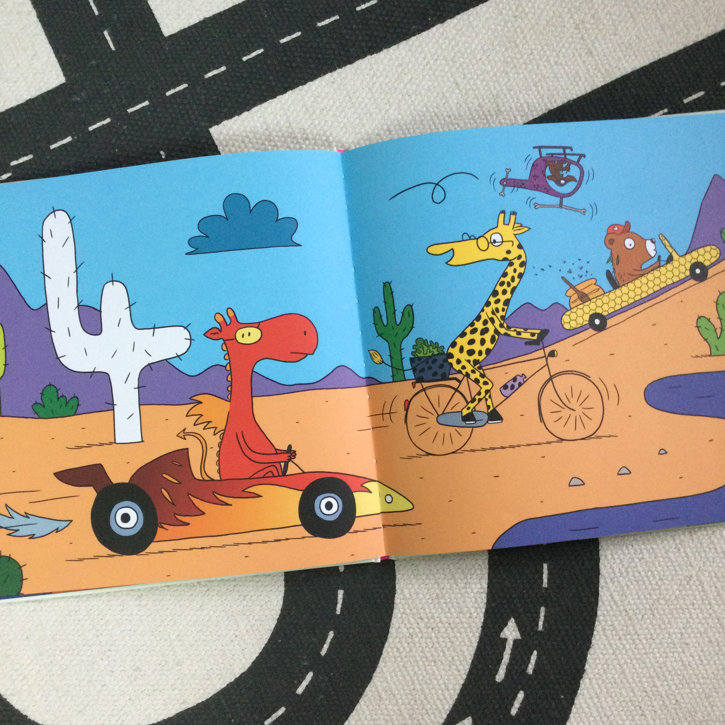 Un ours est dans une auto en cire d’abeille survolé de près par un chien en hélicoptère lui-même suivi d’une girafe à bicyclette, tous trois poursuivis par un dragon en voiture de course, lorsqu’un loup crâneur en jet-ski fait son apparition, tirant une souris verte en ski nautique et ainsi de suite… Tous les animaux à bord de leur véhicule aussi bien sur terre qu’en mer ou dans les aires participent à une sorte de course effrénée et agrémentée d’un nouveau participant à chaque double page.