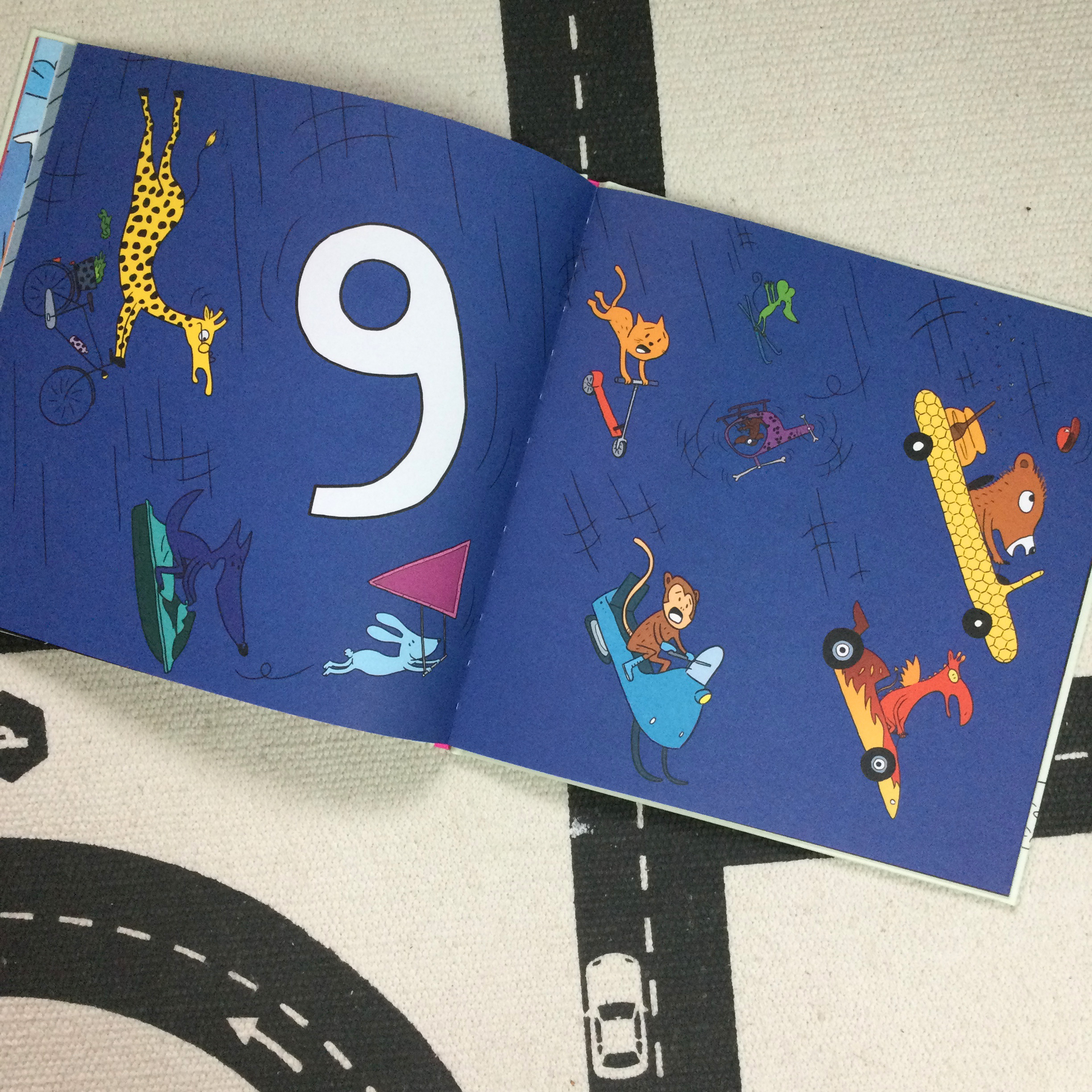 Cet album sans texte est un livre à compter chargé de suspense ! L’air de rien le petit lecteur est actif ! De page en page, nous découvrons un nouveau chiffre avec un nouvel animal et un nouveau moyen de déplacement dans un nouveau décor avec toujours cette question : MAIS OÙ VONT-ILS ?