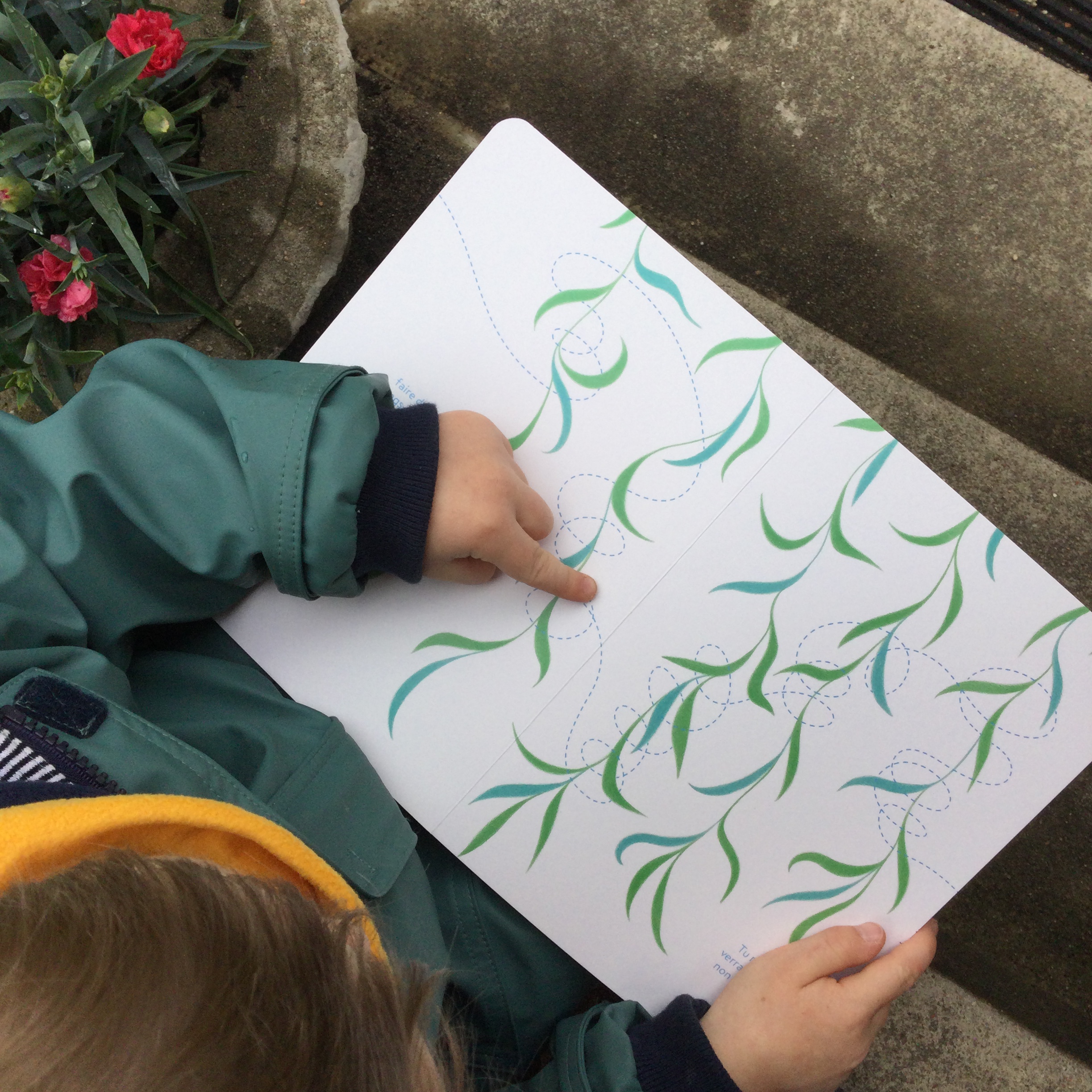 (…) le tout-petit est invité à suivre le vol d’un papillon avec le bout du doigt.