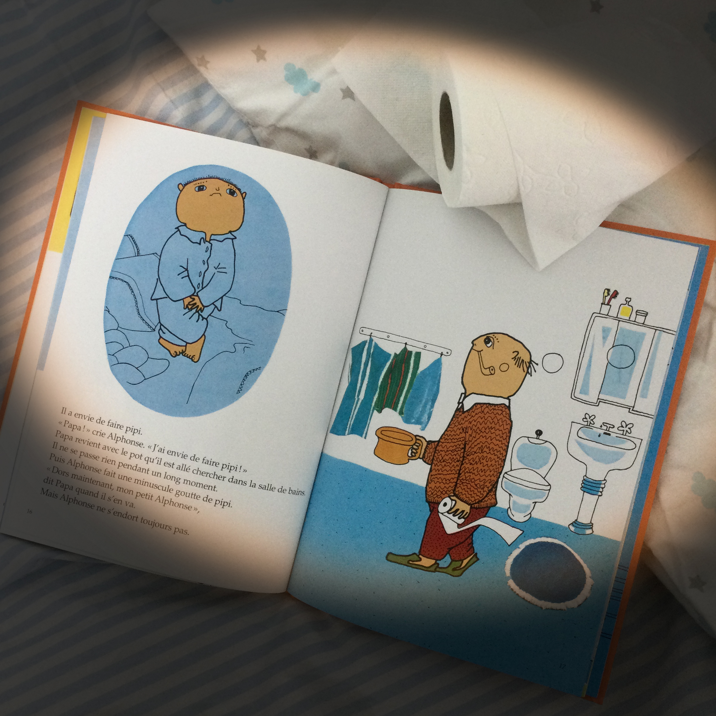 Alphonse et son père forment un duo aimant, attachant et dans lequel nous pourrions volontiers nous reconnaître. Finalement, cette histoire à peine plus exagérée que ce qu’il se passe dans nos foyers le soir au moment du coucher, est une bonne manière d’insuffler à nos enfants que nous ne sommes pas dupes, et que si nous faisons au mieux pour les rassurer, qu’ils ne se sentent pas obligés de répéter le même scénario tous les soirs…