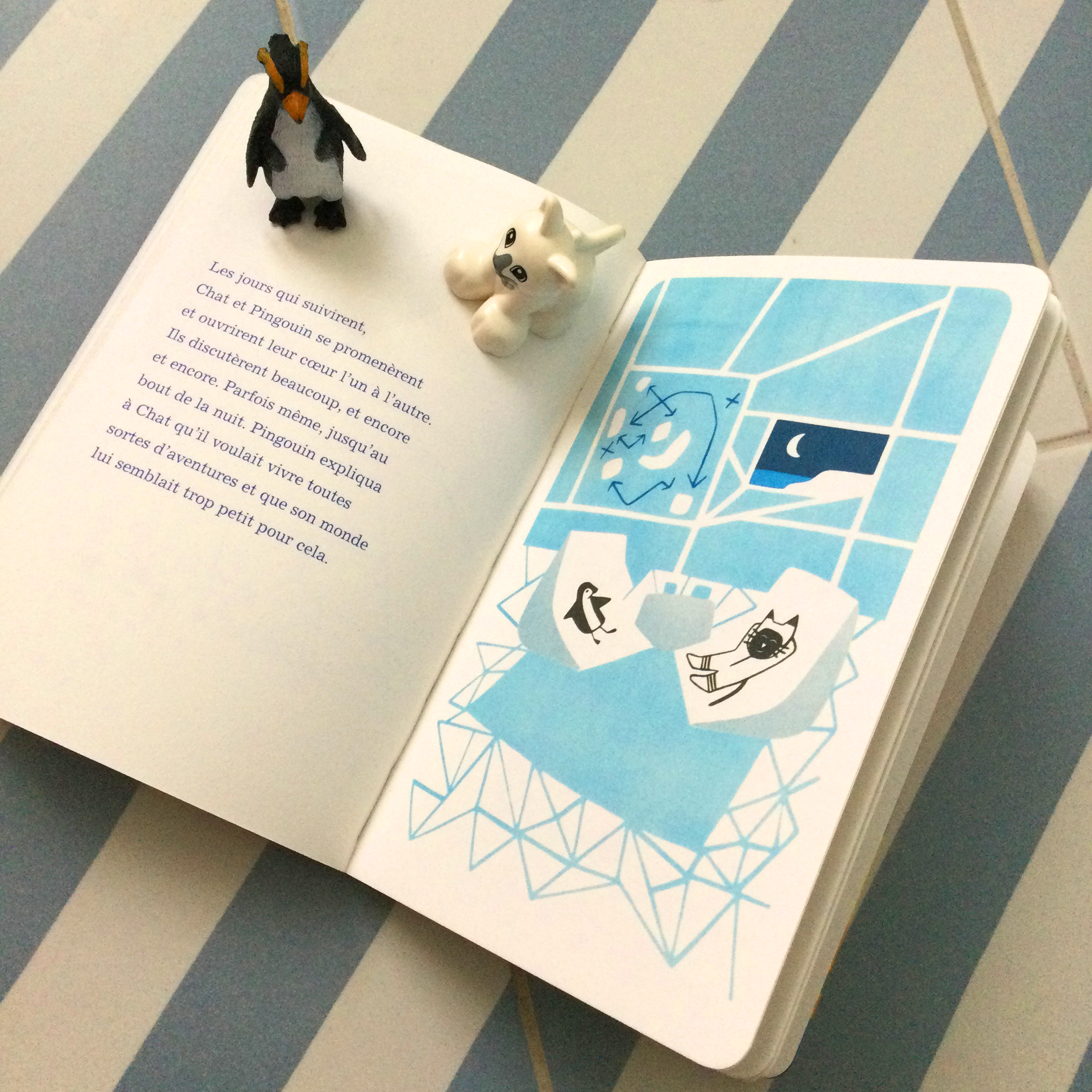 LA RENCONTRE d’un pingouin et celle d’un chat n’a rien d’évident ! Et pourtant, LA RENCONTRE a bien lieu sur la banquise de Pingouin lorsque Chat débarque après un long voyage et après avoir découvert un petit morceau de papier dans une bouteille jetée à la mer ; une bouteille jetée à la mer par Pingouin de l’autre côté de la terre.