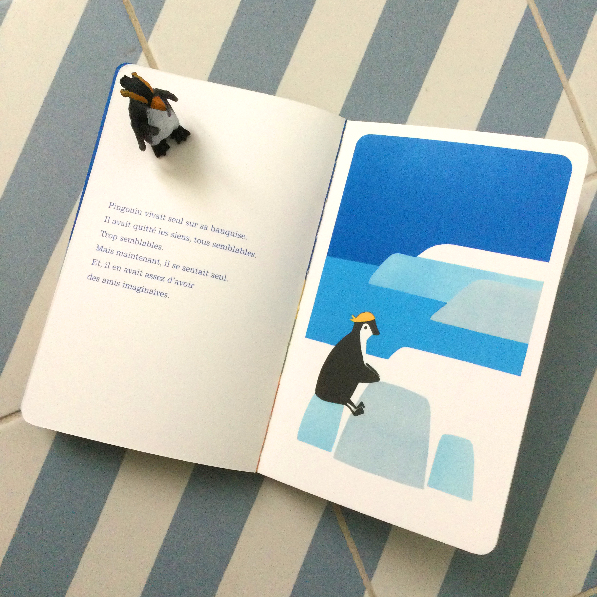 Pingouin vit seul sur sa banquise car il se sentait différent de ses semblables alors il s’était mis à l’écart. À la recherche d’un ami c’est ainsi qu’il a l’idée de jeter une bouteille à la mer. Puis, LA RENCONTRE tant espérée a lieu. Pingouin et Chat apprennent à se connaître. Même si ces deux là deviennent amis, même s’ils aiment partager leurs loisirs, même s’ils sont curieux l’un de l’autre, Chat peut-il vraiment vivre déraciné, loin de son pays ? Pingouin peut-il vraiment accueillir durablement Chat sur sa banquise ?