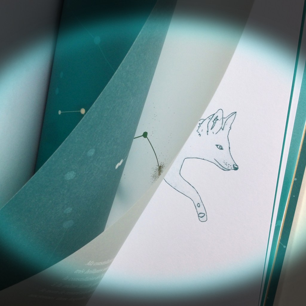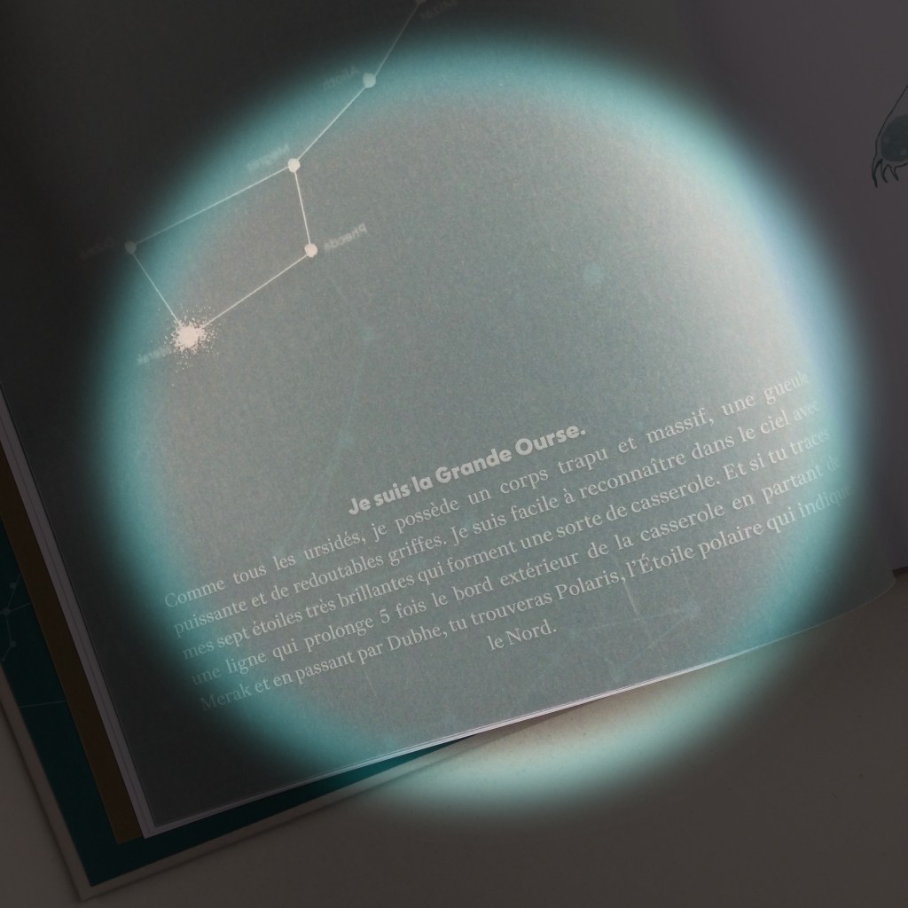 Sous forme de devinette les CONSTELLATIONS sont présentées tour à tour. Les pages alternent entre les devinettes et des pages en papier calque qui dessinent les CONSTELLATIONS dans le ciel. Ces dernières se superposent aux illustrations délicates de Jeanne Picq pour mieux saisir la forme annoncée. Enfin, les réponses aux devinettes donnent les clés et l’histoire de chaque constellation. Nous découvrons ou redécouvrons ainsi, les rêves des hommes à travers les âges, leurs légendes, leurs croyances.
