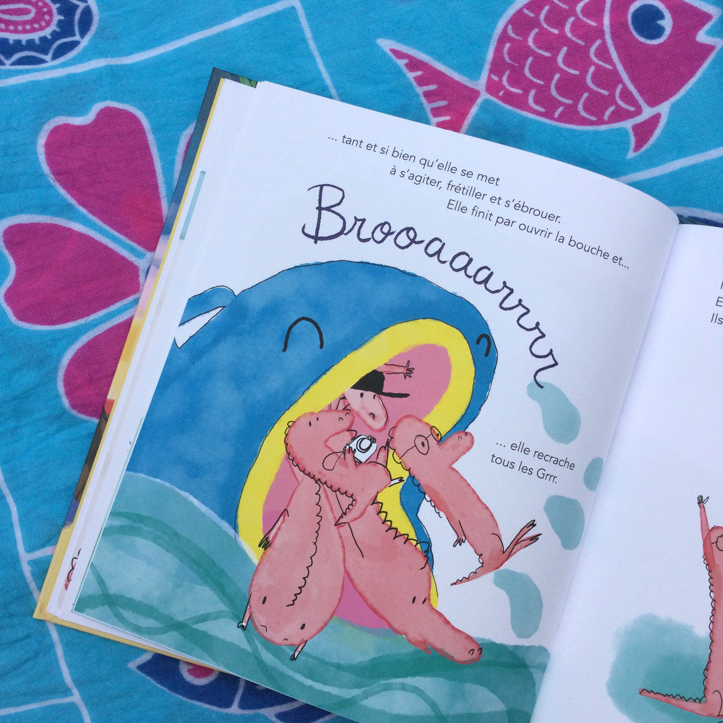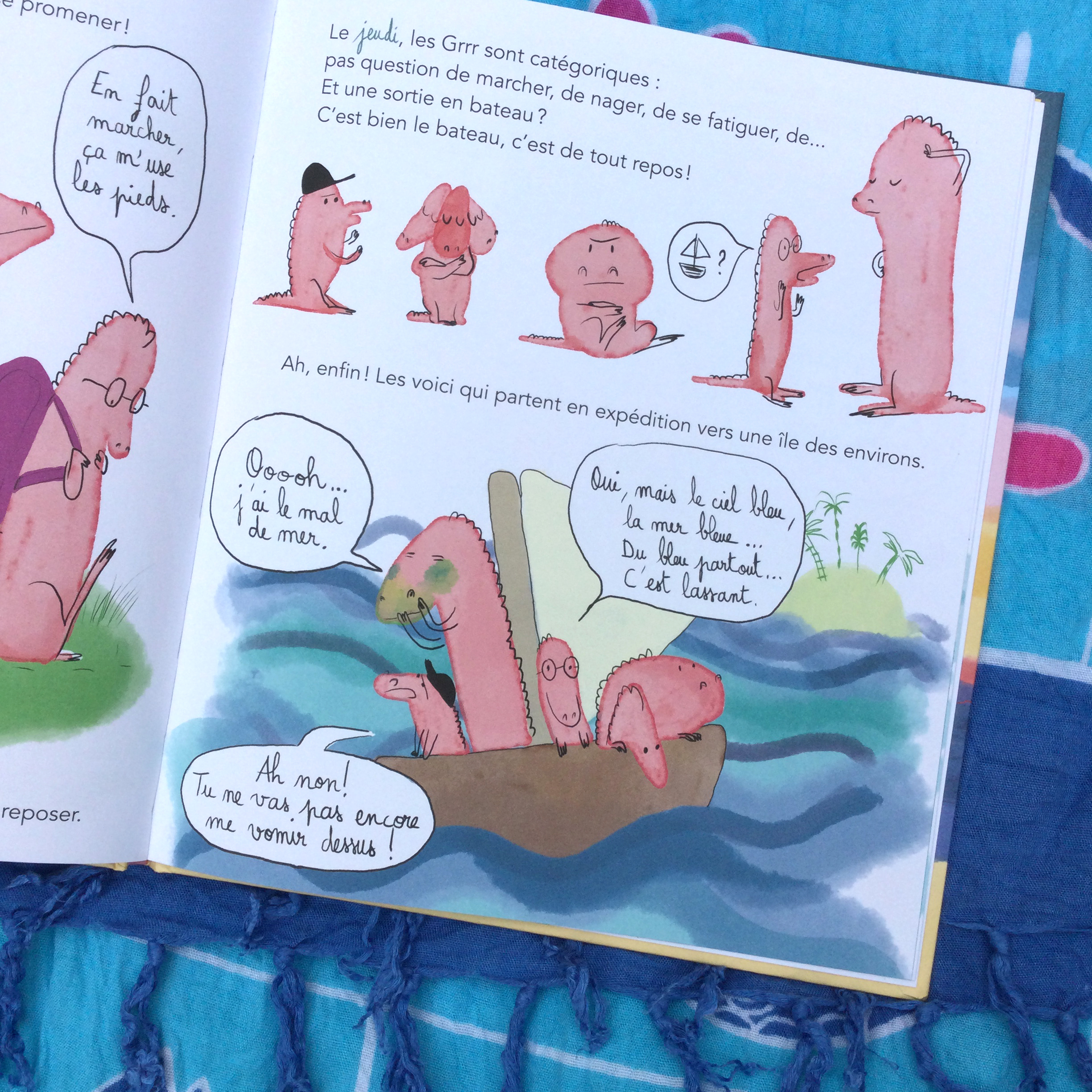 Bref, les GRRR dans cet album partent en vacances qu’ils ont certainement bien mérité. Mais comme vous pouvez l’imaginer, tout est prétexte à grommeler. Sur la route personne ne conduit comme il faut, les petits ont envie de vomir et lorsqu’ils sont enfin arrivés à la mer la semaine de détente prévue vire à l’enchaînement de petits tracas. Jusqu’à ce que LES GRRR EN VACANCES se fassent avaler par une grosse bête ! Et c’est là que les choses sérieuses commencent, plus question de râler pour des petits riens, il va falloir se serrer les coudes !