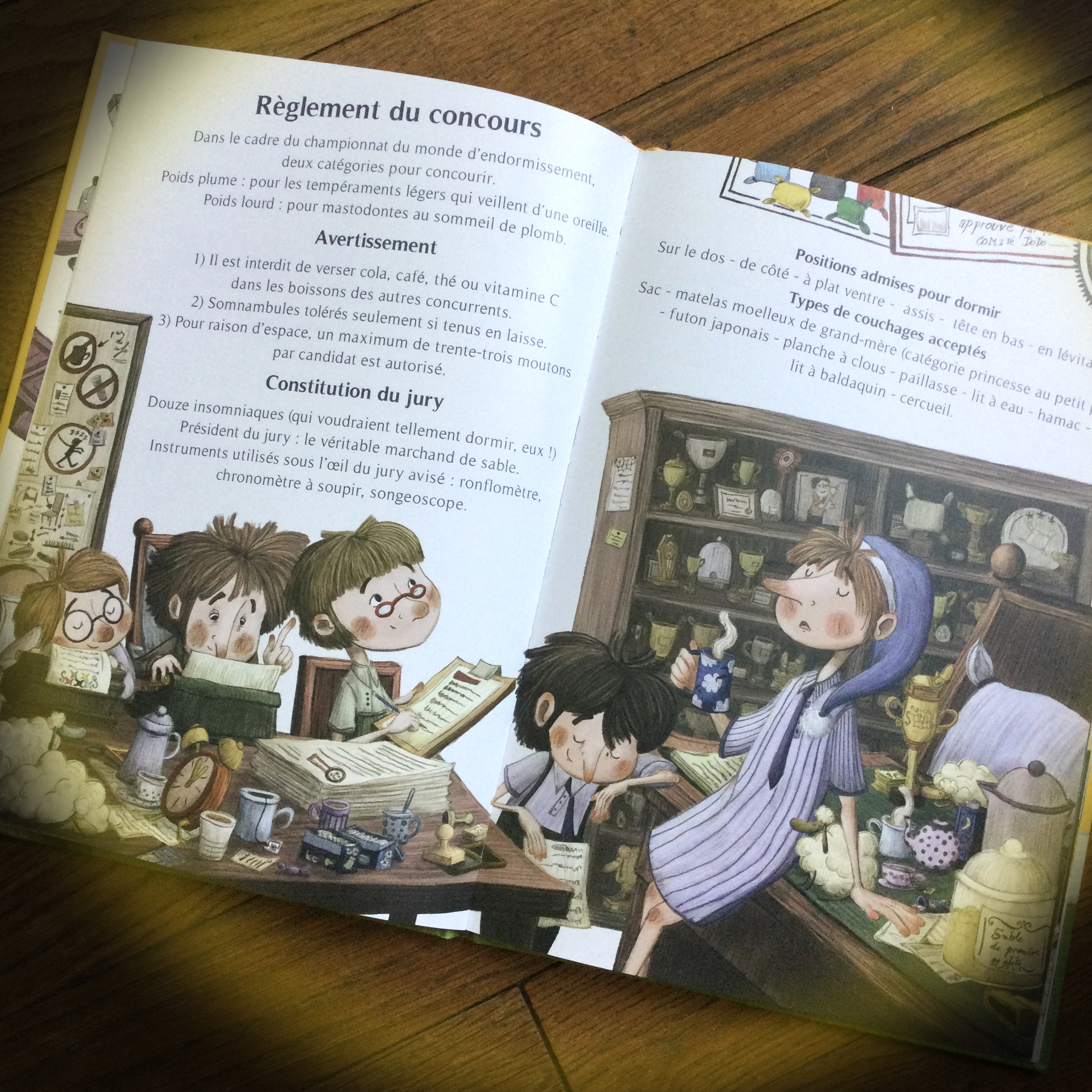 L’autrice Marine Paris utilise toutes les anecdotes possibles autour du champ lexical du sommeil. Cet album qui regorge de situations impossibles et d’inventions folles, dessine également les éléments d’une participation à un grand concours avec tout ce que cela implique, perdre, gagner, accepter, tricher, la chance, le talent.