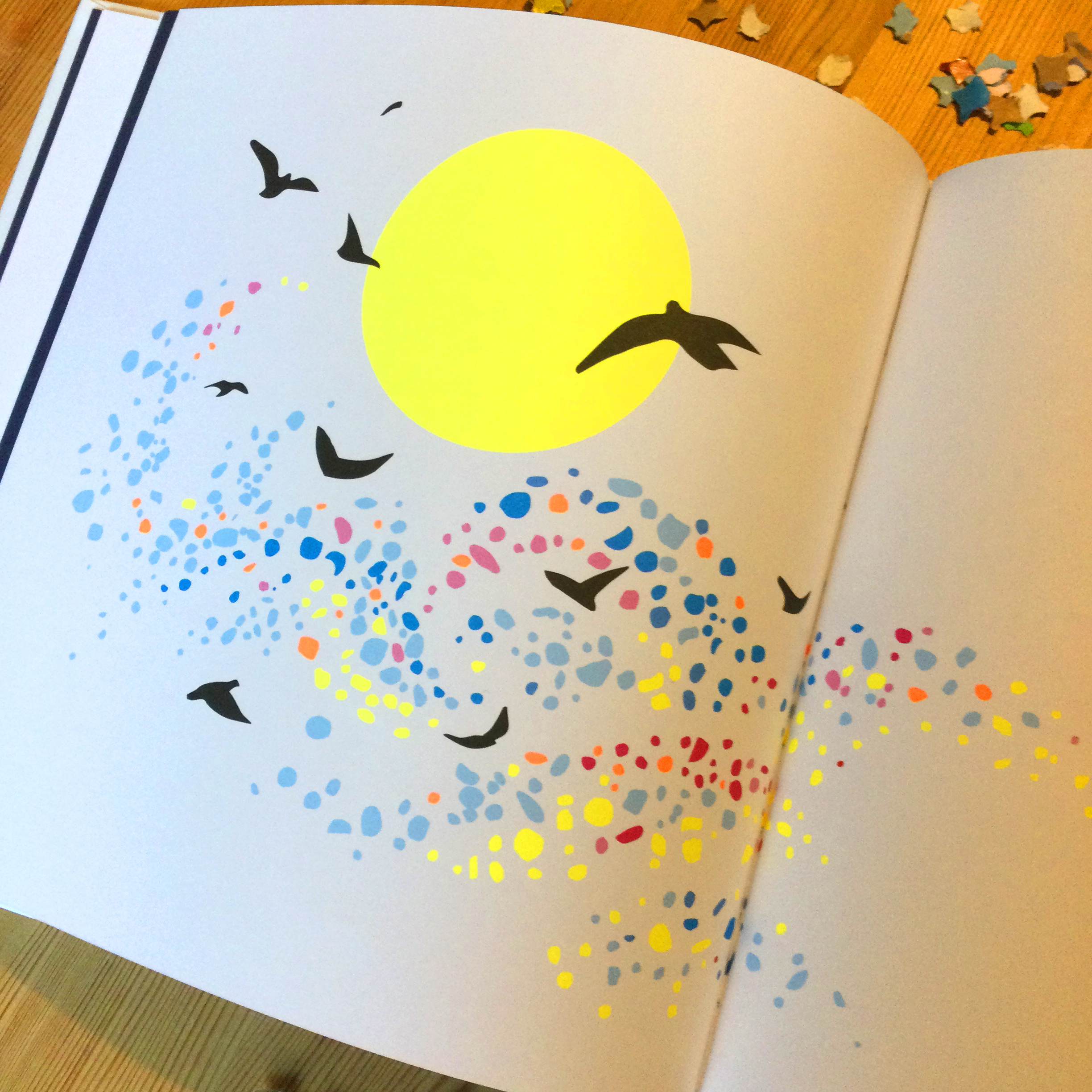 Les saisons filent et défilent POUR TOUJOURS. Les oiseaux s’envolent, la pluie, le vent arriveront et repartiront sans cesse, POUR TOUJOURS. POUR TOUJOURS la nuit tombe et POUR TOUJOURS le jour se lève. La vie est une multitude d’éléments changeant qui vont et viennent dans un mouvement perpétuel. Parfois, l’absence, le manque, la mort surgissent mais POUR TOUJOURS nous pouvons compter sur la solidité de l’amour. Au milieu de tous ces événements qui font partie de la vie et dont nous sommes les spectateurs, chérissons fort les « éclats de rire, mots doux, couleurs… » bien au chaud dans notre cœur.
