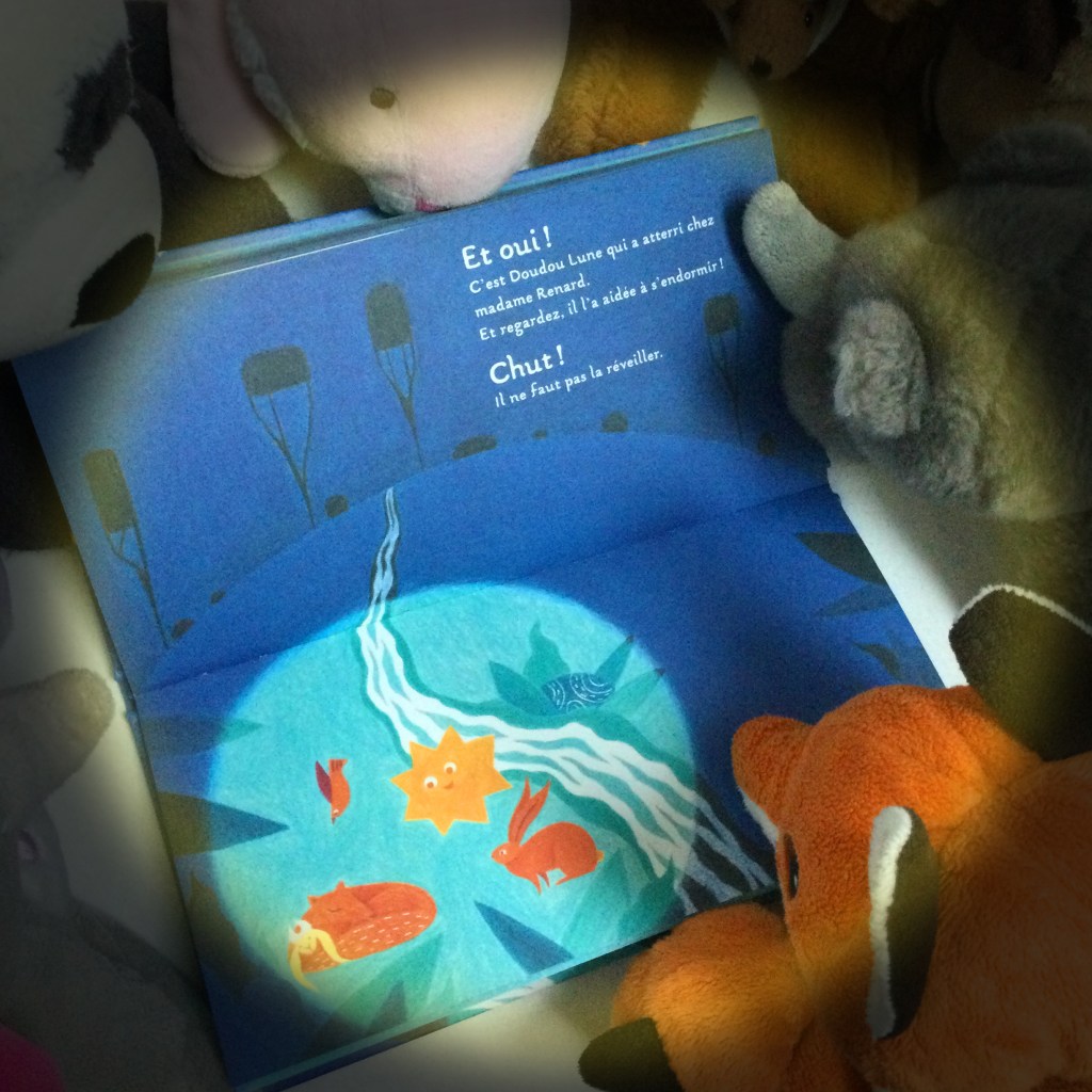 « Et oui ! C’est Doudou Lune qui a atterri chez madame Renard. Et regardez, il l’a aidée à s’endormir ! Chut ! Il ne faut pas la réveiller. »