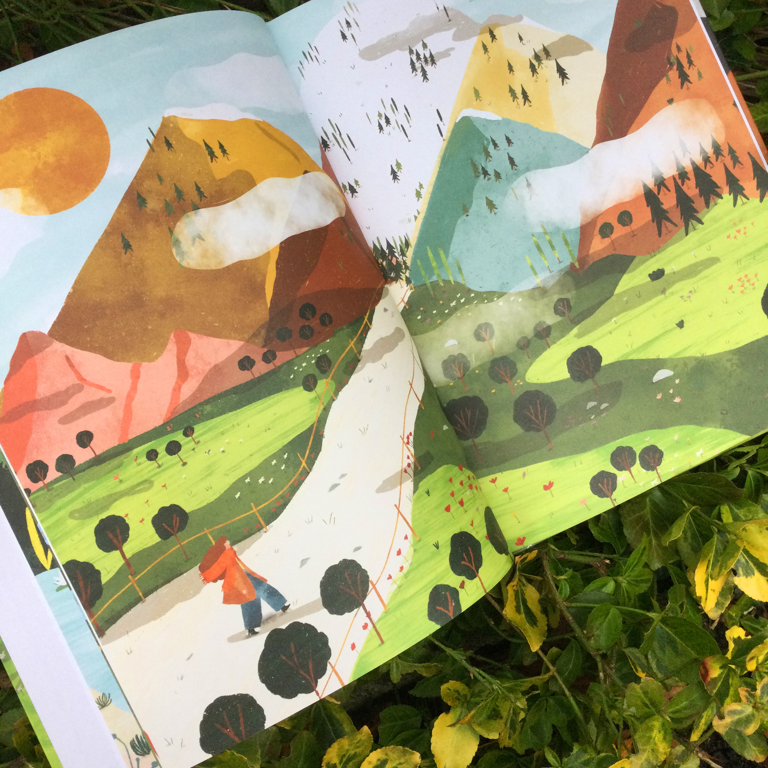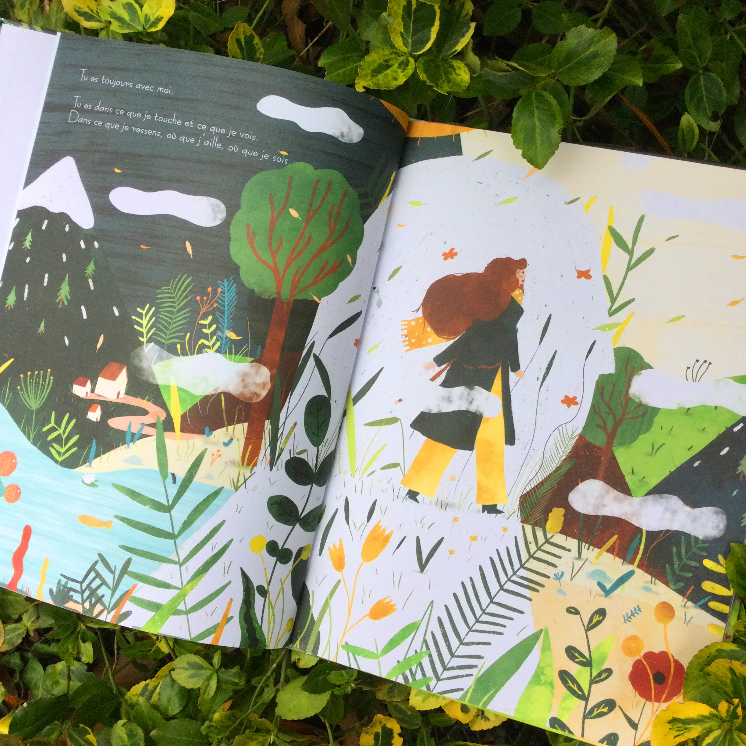 Nous parcourons avec la narratrice un long sentier au détour duquel notre âme se sent comme irrémédiablement liée à la nature qui nous entoure. C’est dans une belle variété de paysages que l’on dialogue intérieurement avec le « tu » de cette certitude annoncée dans le titre : TU ES TOUJOURS AVEC MOI. Chez SAKILI nous avons pensé que ce « tu » s’adressait aussi bien à un être cher disparu, à Dieu, à une force créatrice, à un petit être à naître, à une âme sœur, à un désir secret ancré en nous, à un souvenir, à la vie… Toute la beauté de ce texte est justement dans le fait qu’il peut parler à chacun de nous, au plus profond de nous. Cette narratrice solitaire au cœur de grands espaces n’est finalement pas si seule. Et c’est à la toute fin de l’album que nous avons saisi que la narratrice pose ses mains sur son ventre arrondi…