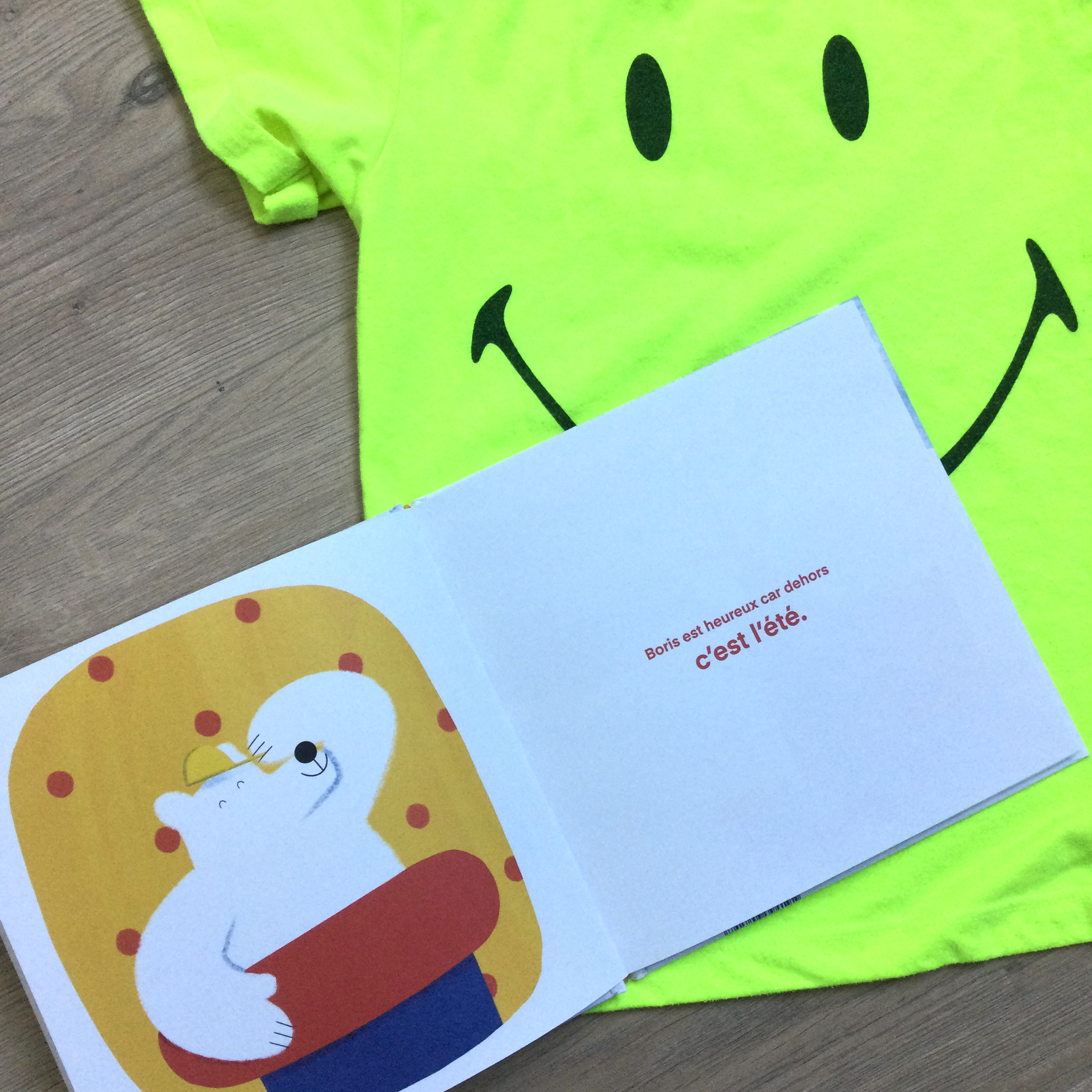En effet, Boris est un ours polaire légèrement impatient et bougon. Sa mine est adorable ! Il n’en peut plus d’attendre l’été, comprendre les beaux jours, la saison chaude, les baignades tout ça, tout ça… Peut-être qu’une part de Boris est vexée car il s’est trompé au début de l’histoire ; il croyait que c’était l’été. Il est tellement obnubilé par son désir d’été qu’il passe à côté de bien d’autres petits plaisirs attribués aux autres saisons.