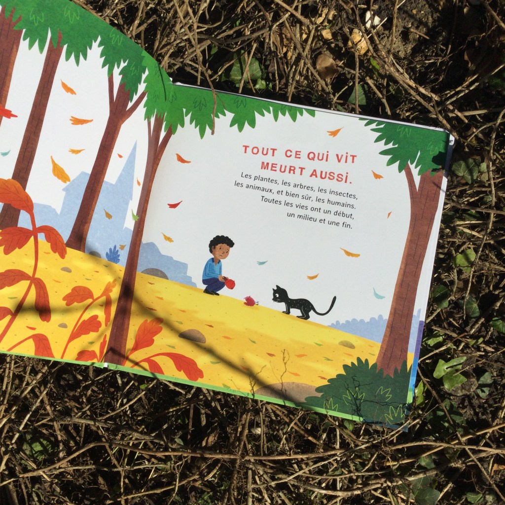 D’abord parce que le duo Rhéa Dufresne et Sebastien Chebret a fait ses preuves et fonctionne parfaitement, mais aussi parce que les livres de cette série sont écrits sous forme de liste. Cela permet d’évoquer multiples facettes de chaque thème abordé. On fait le tour de la question avec des mots simples et justes, le tout porté par des illustrations lumineuses où les scènes sont très ancrées dans le quotidien de nos enfants. Ici, il est bien évoqué que la mort fait partie de la vie… La tristesse sans être effacée est abordée comme un sentiment universel, une étape. Les croyances, les rituels, les souvenirs partagés, les moments seul, tout cela montre les différents aspects de cet événement qui « effraie beaucoup moins quand on en parle! ».