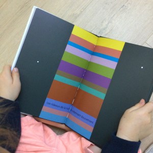 Puis il peut faire nuit, le jour… ! C’est une partie de cache-cache… A midi le monde est bien réveillé et cela s’agite partout ! Plus question de lenteur, les doubles-pages présentent des silhouettes colorées, en mode imagier.